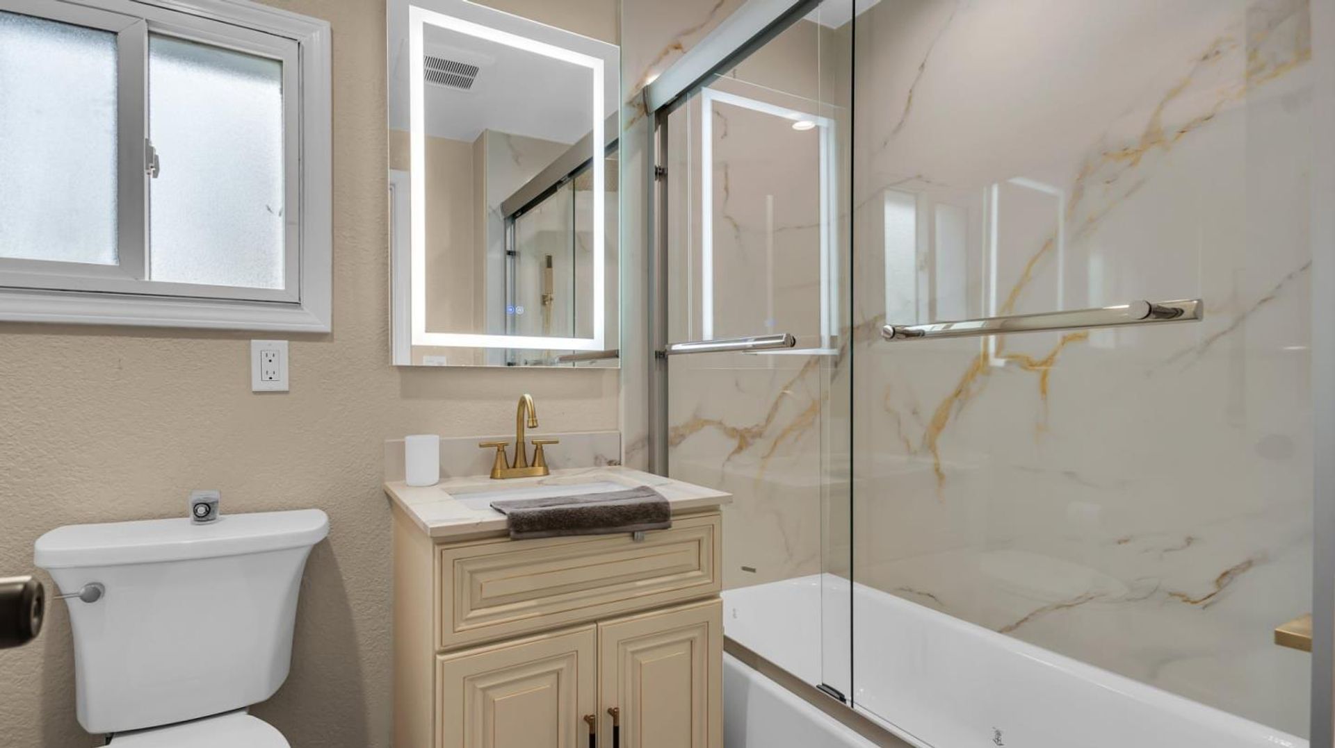 The remodeled kitchen is designed to impress, complete with stone countertops, new cabinetry, updated appliances, and sleek fixtures — ideal for both daily living and entertaining. Both bathrooms have been thoughtfully renovated with elegant stone tile, modern vanities, and stylish finishes.
