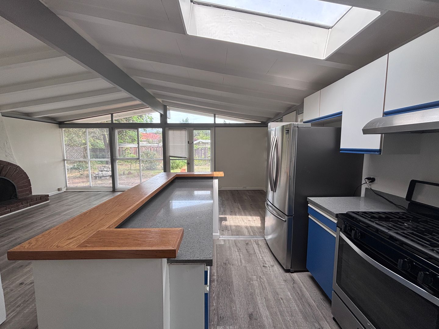 Charming 3-bedroom, 1-bath home situated on a large cul-de-sac lot with a private patio and yard. The home features a spacious living room with a custom fireplace, a remodeled kitchen with LVP flooring and stainless steel appliances, wall-to-wall windows, and an updated bathroom with a sunken tub. Two skylights provide additional natural light throughout.